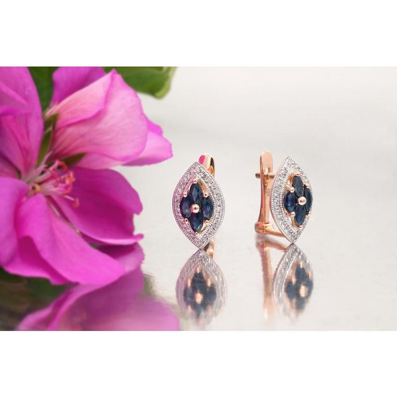 Gold earrings with 'english' lock, Red Gold 585°, Rhodium (Plating), Diamonds, Sapphire