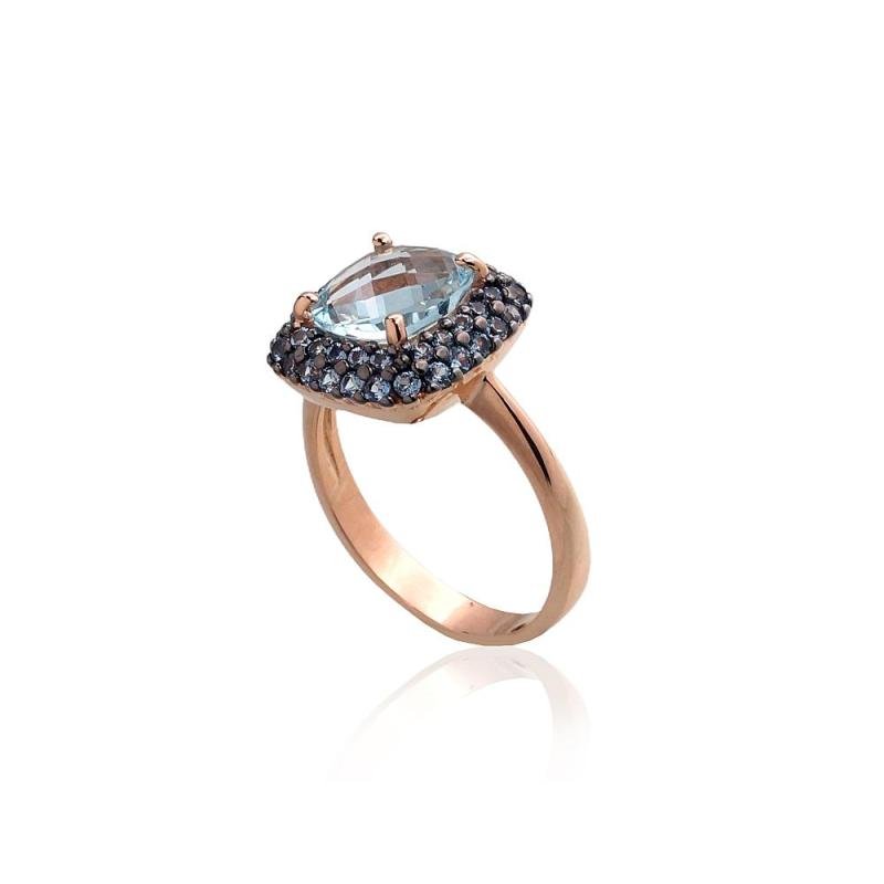 Gold ring, Red Gold 585°, Rhodium (Plating), Zirkons, Sky Blue Topaz