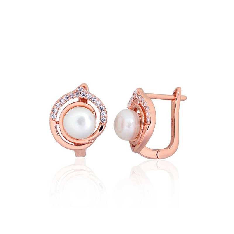 Sidabriniai auskarai ant cilindrinės spynos, Sidabras 925°, raudonas auksas (padengti), Cirkonai, Perlai
